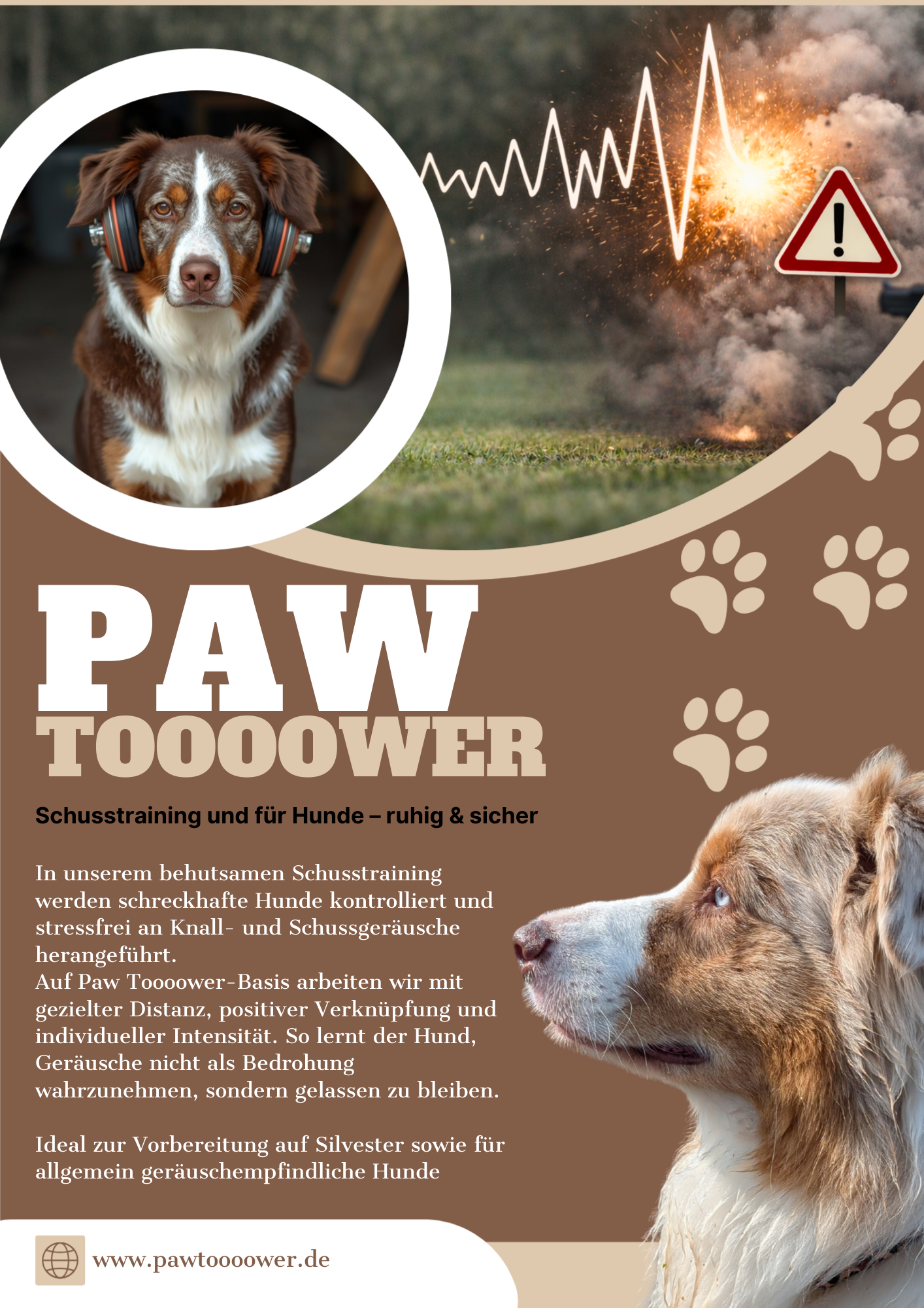 Aufgrund der hohen Nachfrage bieten wir bei Paw Toooower ein strukturiertes Geräusch- und Knalltraining für Hunde an. Ziel ist es, Hunde kontrolliert, ruhig und individuell an Knallgeräusche, Schüsse und ähnliche akustische Reize heranzuführen und diese positiv abzuspeichern. Durch den schrittweisen Trainingsaufbau wird Stress reduziert und das Sicherheitsgefühl des Hundes nachhaltig gestärkt – für mehr Gelassenheit im Alltag und in außergewöhnlichen Situationen.
